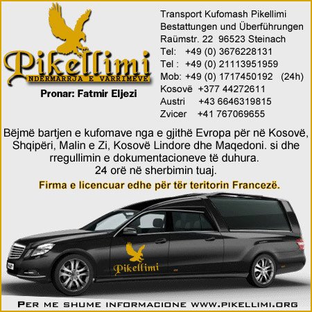 “NDERMARRJA E VARRIMEVE PIKELLIMI” – Firma Pikëllimi bënë bartjen e kufomave nga vendet e ndryshme perëndimore për në viset shqipëtare (Kosovë, Shqipëri, Maqedoni, Malin e Zi). Shërbimet i bëjmë në bashkëpunim dhe koordinim me familjarët për të cilët kryhet shërbimi.